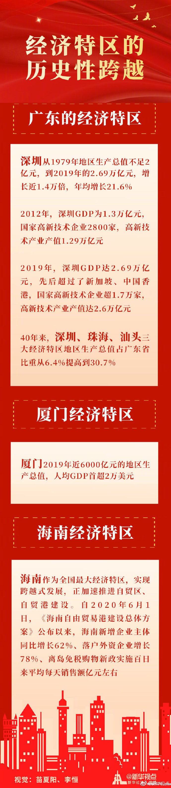 40年来,深圳、珠海、汕头三大经济特区地区生产总值占广东省比重从6.4%提高到30.7%;厦门去年近6000亿元的地区生产总值,实现近千倍的跨越,人均GDP首超2万美元;作为全国最大经济特区的海南,实现跨越式发展,正加速推进自贸区、自贸港建设……