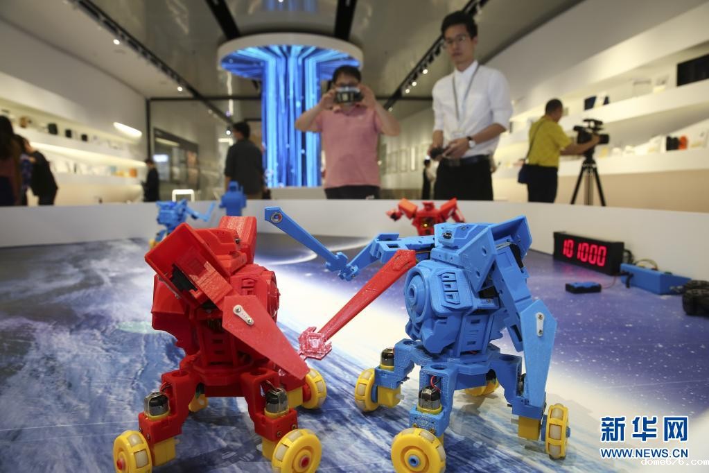 (4月19日,在广东工业设计城创新科技馆,工作人员在展示机器人“速斗无人区”。新华社记者 殷刚 摄)