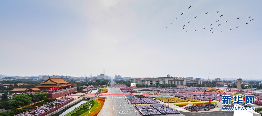 雄鹰翱翔,振翅长空。7时55分许,中国人民解放军71架战机飞向天安门广场,向党致敬,向祖国致敬,向人民致敬。空中护旗梯队拉开飞行庆祝表演序幕,5架直升机分别悬挂中国共产党党旗和写有“伟大的中国共产党万岁”“伟大的中国人民万岁”“伟大的中华人民共和国万岁”“全国各族人民大团结万岁”的条幅迎风向前。随后,直升机、战斗机分别组成“100”“71”字样掠过长空,15架歼-20飞机组成3个梯队呼啸而过,教练机拉出10道彩烟,精彩的表演激起一阵阵欢呼声。